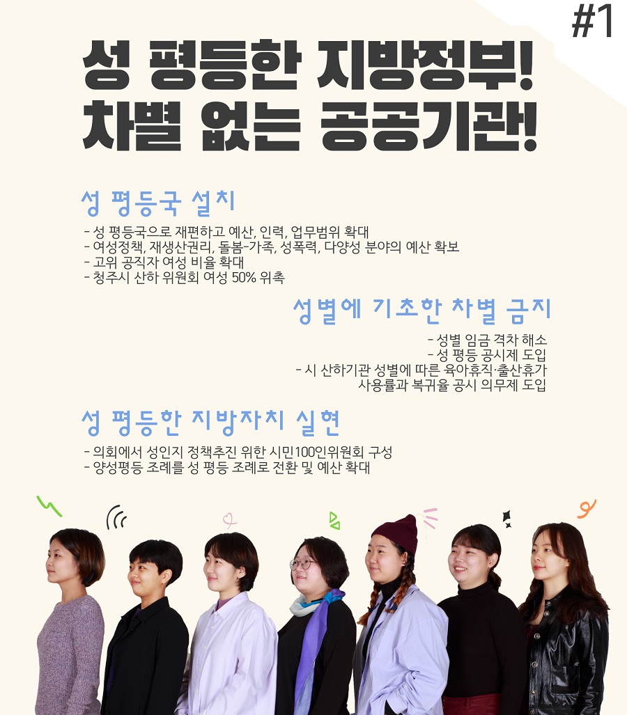 얼마 후, 내가 속한 청주페미니스트네트워크 ‘걔네’ 안의 백래시 대응팀으로부터, 청주시의회 의원 선거 예비후보에 떼거리로 나가자는 제안을 받았다. 청주페미니스트네트워크 ‘걔네’는 작년 11월에 발족한 곳으로, 지역 내 페미니스트들을 연결해보자는 취지로 만들어졌다. 발족 당시는 30여 명이었던 회원이 현재는 두 배로 늘어나 청주에서는 제법 큰 활동력을 가진 네트워크이다.