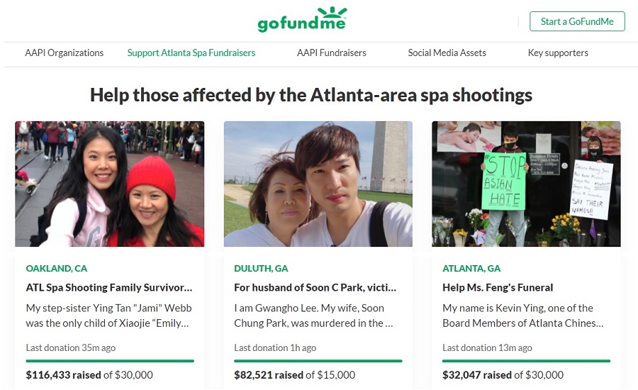 ![]() ▲ Asian Americans and Pacific Islanders(AAPI) 커뮤니티에선 애틀란타 마사지 업소 총격 사건 피해자와 유족을 돕기 위한 후원을 진행하고 있다. (출처: Gofundme의 Stop AAPI Hate 사이트 https://www.gofundme.com/c/act/stop-aapi-hate) |
