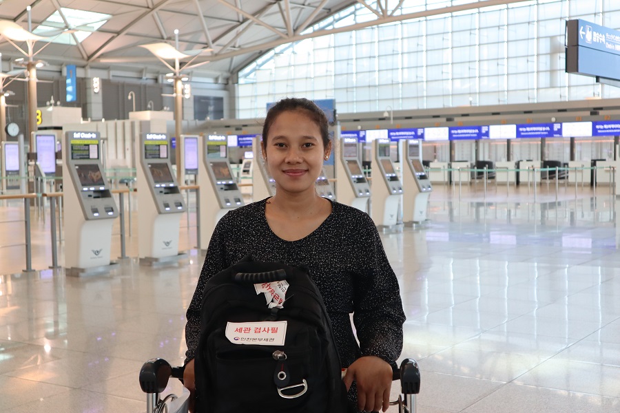 6. 프놈펜 국제공항 안의 모습입니다. 2020년 2월, 한국으로 떠나는 이주노동자들이 탑승수속을 위해 한 줄로 서있습니다. 검은 점퍼 앞 쪽에는 캄보디아 국기와 한국 국기가 조그맣게 붙어있고, 뒤에는 캄보디아어로 “캄보디아"라고 쓰여있습니다. 각각의 가방에는 각각의 사연과 꿈이 담겨있습니다.