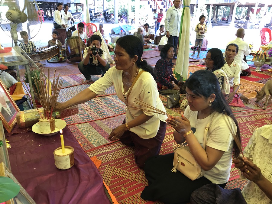 19. 겨울에는 농장의 일이 많지가 않습니다. 이 때, 이주노동자들은 본국에 돌아가서 1-2달 지내고 옵니다. 이주노동자들은 캄보디아에서 약혼식과 결혼식을 하기도 하며, 어머니 생일 잔치를 마을사람들과 함께 모여서 성대하게 치르기도 합니다. 사진에서처럼 생일을 맞이한 어머니는 감사한 마음을 담아 돌아가신 분들의 명복 또한 빌기도 합니다.