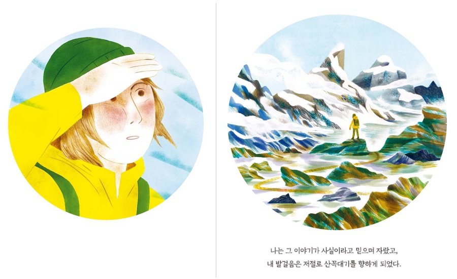 이 책의 첫 장은 하늘 풍경이 작은 원안에 담긴 모습이다. 다음 장으로 넘기면 설산을 담은 조금 더 큰 원이 나오고, 책장을 넘길수록 점점 더 큰 풍경으로 확대되어서 보는 이를 풍경 속으로 끌어들인다. 그리고, 산을 오르는 한 여자가 보인다. 여자는 어릴 적부터 들었던 전설 속 산골짜기 마을을 찾아 나서는 길이다.