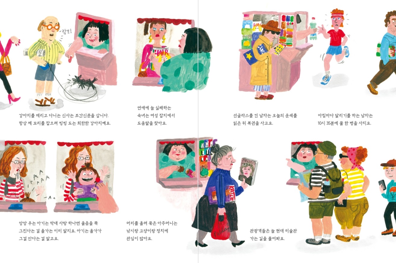 이 책의 또 다른 볼거리는 단골손님들이다. 올가의 움직임에 따라 단골손님들의 위치와 표정, 움직임의 변화 역시 눈여겨보자. 당신들이 거기 살고 있기에, 키오스크의 창을 통해 올가와 소통하고 있기에, 어쩌면 올가는 계속 올가의 인생을 마음껏 살아갈 수 있는 건지도 모른다.