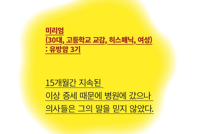 하지만 상태는 점점 나빠졌고, 통증도 심해지자 미리엄은 유방 MRI를 요구했다. 이 때도 “유방 MRI 검사는 아무 데서나 할 수 있는 게 아니라거나 월경이 끝나고 며칠 안에 받아야 한다”는 안내를 받지 못했다. 관련 정보를 스스로 습득해야 했고, MRI 예약에 어려움을 겪었다. 거기다 보험회사는 “40대가 안 되었다는 이유로 유방 촬영 비용도 지불을 거절”했다. 이 모든 장벽들을 넘은 후 미리엄은 암이라는 진단을 ‘받아냈다’.