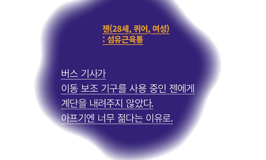 문제는 여기서 그치지 않는다. 젊고 아픈 여성들이 차별과 편견을 마주하는 건 병원뿐만이 아니라 모든 사회 생활에서다. 길에서 모르는 사람이 흉터를 빤히 쳐다본다거나, 지팡이를 짚고 걷는 것에 괜한 말을 얹는 건 그나마 약과다. 건강에 문제가 있다는 것이 드러났을 때 직장이나 사회생활, 친구나 애인, 파트너에게서도 거부를 당하는 일을 접하게 된다.