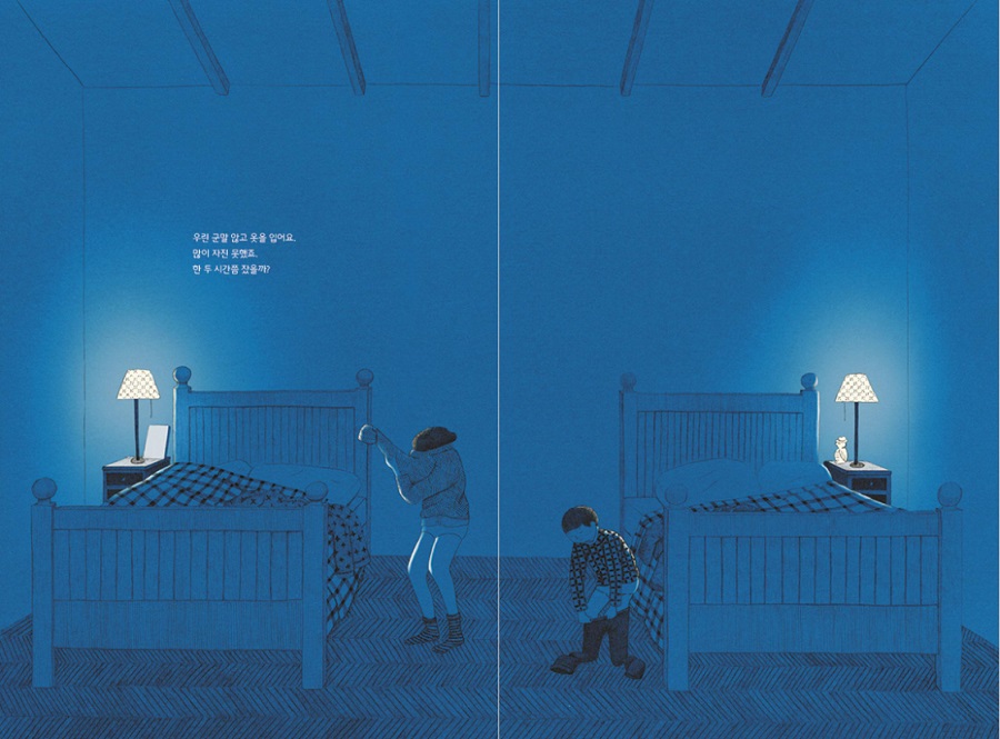 책장을 넘기면, 두 아이가 주섬주섬 옷을 입는 장면이 나온다. 한두 시간밖에 자지 못했지만 아이들은 ‘군말 않고’ 채비를 한다. 그다음 장은 막 집을 나선 가족의 모습이다. 맨 앞에 엄마, 그 뒤에 남자아이, 여자아이, 맨 뒤에 아빠가 일렬로 나아가고 있다.